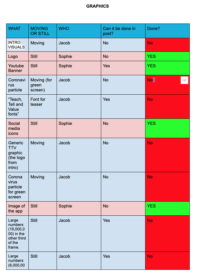The final piece of Production Paperwork that I had to complete was the brief for the graphics. This was made by using the 'Graphics to do' list in fig. 35. I started by going through the table and titling each section in the brief document with the name of the graphic, I then added a short description for each moving graphic, an image if it was needed and colours if they were needed, and then I concluded with with any useful links. This document was unbelievable helpful during the creation of moving graphics as it was a space where I could describe all ideas for Jacob to see and saved so much time doing it this way rather than having to explain it face to face. The only thing that I would change in future is adding more description to each section, this is to make everything completely clear as we did have problems a few times where descriptions were slightly miss-understood. Therefore I feel adding more information would help with this.
